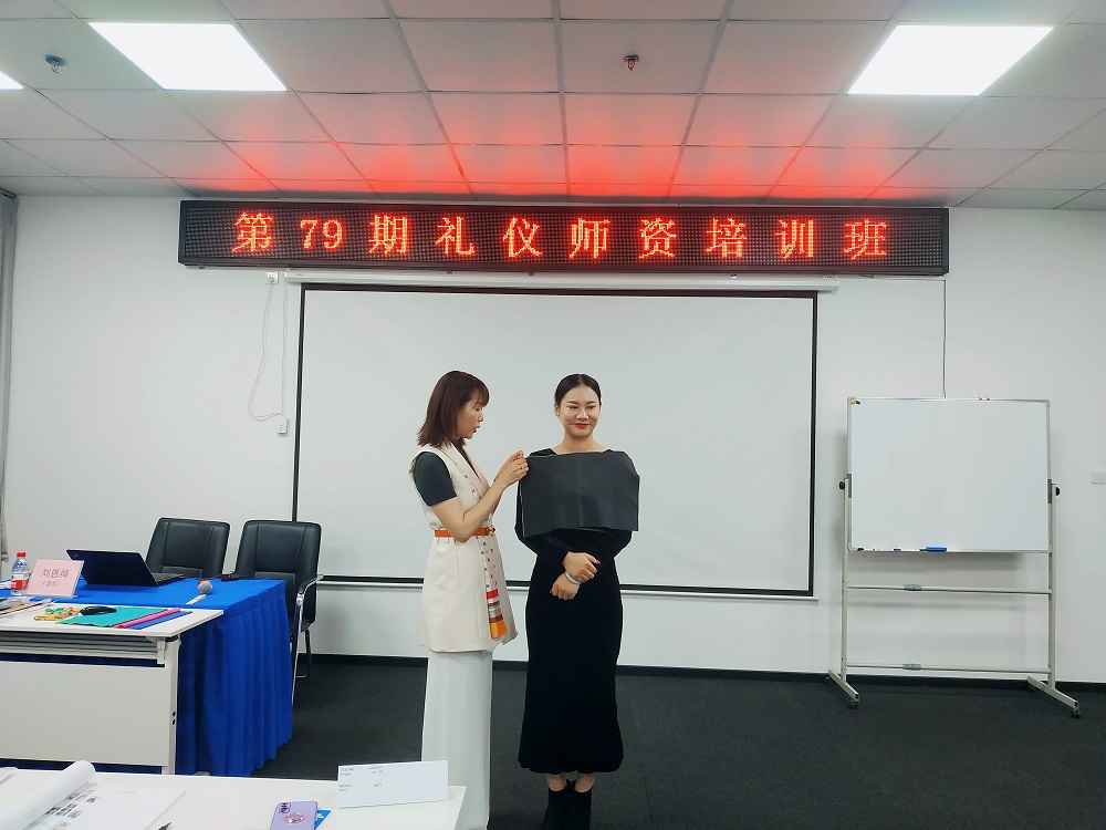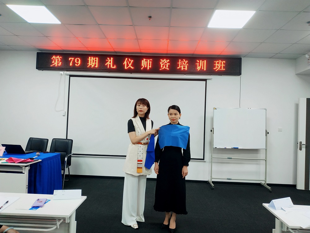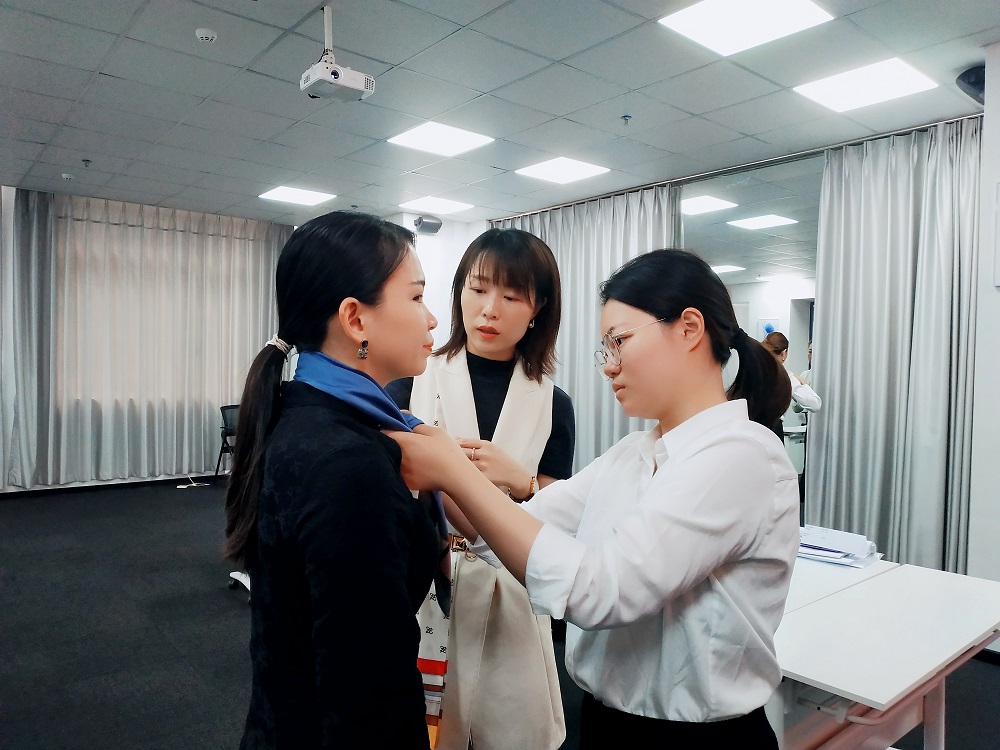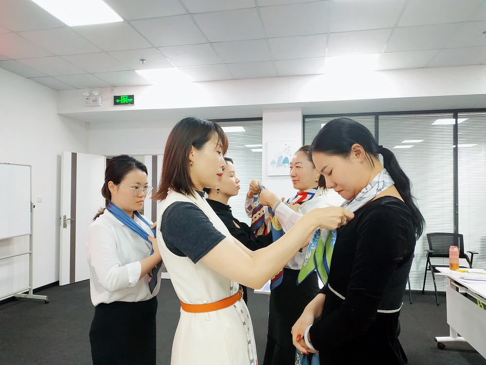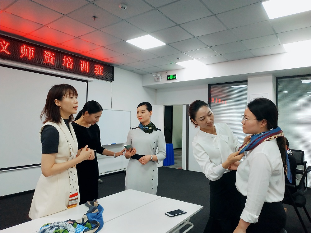 劉老師為大家講解了服裝色彩搭配等方面的理論知識,并教授學(xué)員如何根據(jù)自己的膚色來選擇適合自己的服裝、如何根據(jù)體形進行搭配服裝、如何靈活運用絲巾搭配來打造職業(yè)禮儀培訓(xùn)師的專業(yè)形象。