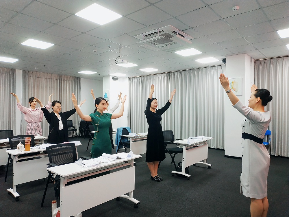 晚間學(xué)習(xí)時間段,由時淑妍老師講授《禮儀操編排教學(xué)》課程。在禮儀操編排教學(xué)課程開始前,時淑妍老師再次從禮儀行為規(guī)范:站姿、坐姿、走姿、蹲姿、指引、握手、遞接物品、等禮儀細節(jié)進行系統(tǒng)的梳理和指導(dǎo)。