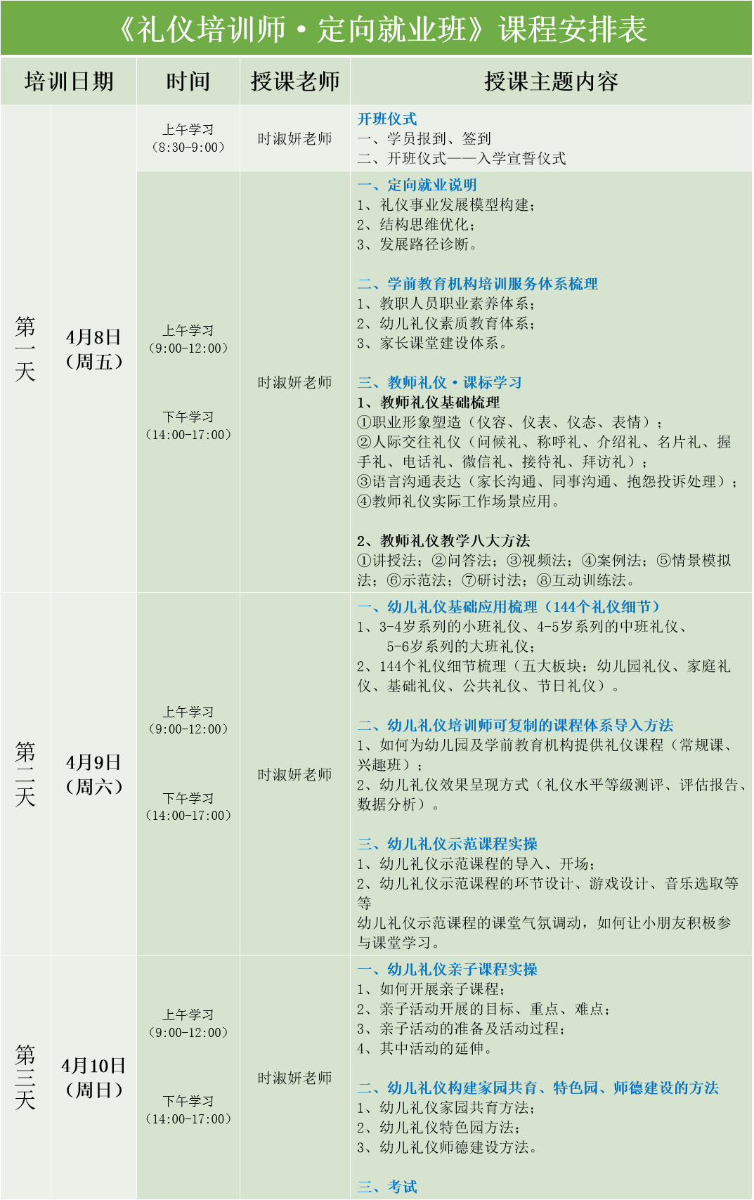 為加快高素質(zhì)禮儀培訓(xùn)師人才培養(yǎng)的步伐,增強(qiáng)禮儀培訓(xùn)師細(xì)分領(lǐng)域授課能力,全面提升禮儀培訓(xùn)師實(shí)際應(yīng)用解決問(wèn)題能力,現(xiàn)面向以服務(wù)學(xué)前教育機(jī)構(gòu)(教職人員、幼兒、家長(zhǎng))的禮儀培訓(xùn)為職業(yè)發(fā)展方向人員,開(kāi)展定向禮儀師資就業(yè)班。