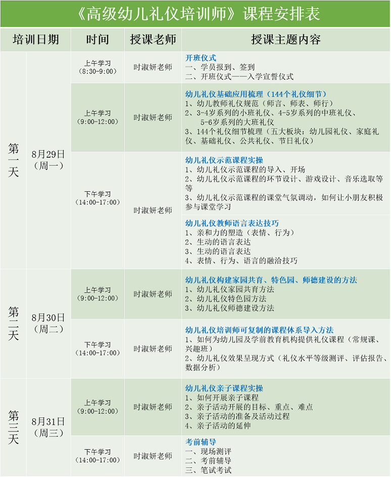 目前很多學前教育機構(gòu)、幼兒園已經(jīng)開展了禮儀課程,為了解決各地幼兒禮儀培訓師資緊缺的問題,幫助幼兒禮儀教育工作者掌握禮儀教學訓練內(nèi)容和教學規(guī)范、增強實際應用授課能力、提高師資水平和質(zhì)量,建立專業(yè)幼兒禮儀培訓教師隊伍,增強禮儀實際應用及教育成果轉(zhuǎn)化,知行德禮教育、廣州市禮儀協(xié)會將于2022年8月29日--31日在廣州舉辦《高級幼兒禮儀培訓師》詳情如下: