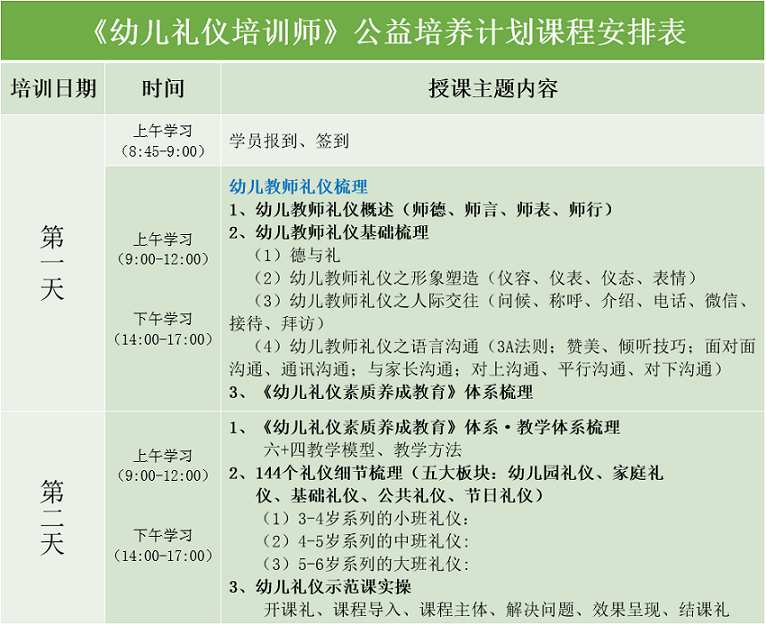 禮儀作為內(nèi)在的品德、品質(zhì)、修養(yǎng)的承載體和言行舉止、待人接物、與人交往溝通具體行為表達(dá),是成長(zhǎng)至關(guān)重要的素質(zhì),也是好家風(fēng)家教的成果展現(xiàn),更是社會(huì)文明程度的體現(xiàn)。為了解決幼兒禮儀培訓(xùn)師資緊張的問(wèn)題,幫助幼兒禮儀教育工作者掌握禮儀訓(xùn)練內(nèi)容和教學(xué)規(guī)范、增強(qiáng)實(shí)際應(yīng)用授課能力、提高師資水平,建立幼兒禮儀授課專業(yè)教師隊(duì)伍,增強(qiáng)禮儀實(shí)際應(yīng)用及教育成果轉(zhuǎn)化,廣州市禮儀協(xié)會(huì)、研禮教育、廣州市德禮教育將于2022年10月22日—23日在廣州開(kāi)展《幼兒禮儀培訓(xùn)師》公益培養(yǎng)計(jì)劃。詳情如下: